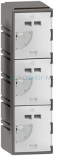Dit model bestaat uit één kolom met drie deuren. De kolombreedte bedraagt 38 cm, de deuropening 30 cm en de binnenmaat 29 cm – ideaal voor het opbergen van een helm, jas of tas. De kast heeft een hoogte van 130 cm en een diepte van 45 cm.