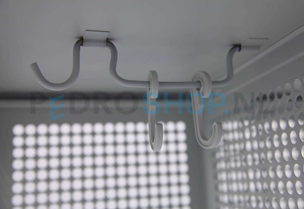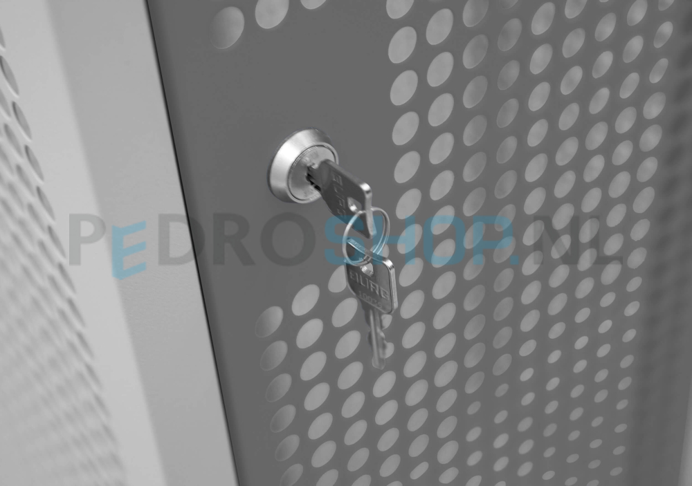 De kast wordt standaard geleverd met een cilinderslot inclusief twee sleutels. De binnenliggende scharnieren maken het mogelijk de deuren tot 90 graden te openen. Onder het legbord bevinden zich twee stevige kunststof kledinghaken voor het netjes ophangen van jassen, tassen of andere items.