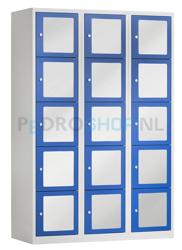 Lockerkast PDC-330, 3-koloms, 15-deurs, transparant venster, blauw