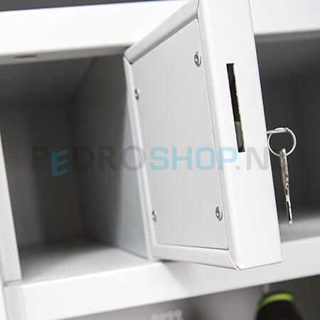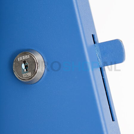 Standaard wordt de PDC-P209 geleverd met een cilinderslot inclusief twee sleutels. Optioneel kan de kast worden uitgerust met een valgrendelsluiting, mechanisch cijferslot of elektronisch pincodeslot. De driepuntsluiting vergrendelt de kast aan de boven-, onder- en zijkant voor maximale veiligheid.