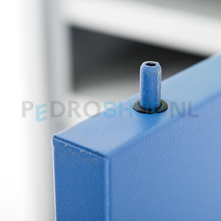 De kast heeft een robuuste, gelaste staalconstructie met versterkte deuren en romp, afgewerkt met een duurzame krasvaste structuur poedercoating. De kleurcombinatie bestaat uit een lichtgrijze ombouw (RAL 7035) met een blauwe deur (RAL 5007). Binnenin zijn drie hoedenplanken aanwezig, met daaronder een kledingstang met haken voor het overzichtelijk ophangen van werkkleding en uitrusting.
