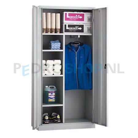 De bezem, dweil, stofzuiger en overige schoonmaakmiddelen netjes opruimen achter slot? Zet hiervoor de PDC schoonmaakkast in. De PDC-T195 bezem- schoonmaakkast is een stevige stalen kast welke beschikt over hanghaken voor opbergen van bezems en dweilen. Over de totale breedte van de kast treft u een legbord. Het linker gedeelte van de kast is voorzien van drie legborden. Door het doorlopende tussenschot ontstaat er meer legruimte in de kast. Doordat er vel legruimte is, is er voldoende ruimte voor het opbergen van schoonmaakartikelen. Het rechter gedeelte van de kast kent een kledingroede met verschuifbare haken.