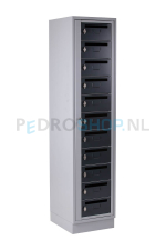 Deze postvakkenkast biedt ruimte voor het opbergen van poststukken en enkele eigendommen. De postvakkenkast kent 1 kolom, deze kolom is voorzien van 11 postvakken. Deze postvakkenkast kent voor de deuren de kleurcode: Antraciet Ral 7016 en voor de ombouw: Lichtgrijs Ral 7035.