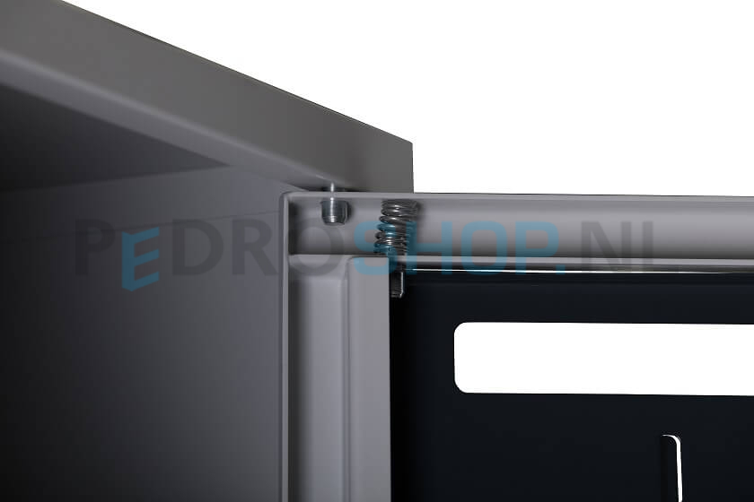 De deuren zijn voorzien van kunststof stootdoppen, dit zorgt ervoor dat de sluiting van de deuren wordt gedempt. De deuren zijn tot 110 graden te openen en zijn rechtsdraaiend. De deuren zijn vlak en kennen een gestanste labelhouder. Ook is de kast voorzien van koppelgaten voor een zijdelingse en ruglingse koppeling. Daarnaast staat deze postvakkenkast op een 10 cm hoge sokkel.
