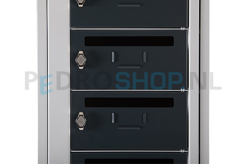 Deze postvakkenkast biedt ruimte voor het opbergen van poststukken en enkele eigendommen. De postvakkenkast kent 2 kolommen, elke kolom is voorzien van 11 postvakken (in totaal 22 postvakken). Deze postvakkenkast kent voor de deuren de kleurcode: Antraciet Ral 7016 en voor de ombouw: Lichtgrijs Ral 7035.