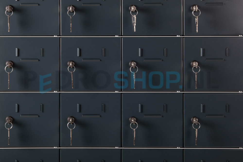 Met een afmeting van h109 x b100 x d30 cm biedt de kast voldoende ruimte voor 25 mini lockers, verdeeld over 5 kolommen met ieder 5 lockers. Elke locker heeft een afmeting van h16 x b15 x d27 cm.