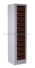 Deze postvakkenkast biedt ruimte voor het opbergen van poststukken en enkele eigendommen. De postvakkenkast kent 1 kolom, deze kolom is voorzien van 11 postvakken. Deze postvakkenkast kent voor de deuren de kleurcode: Bruin Ral 8016 en voor de ombouw: Lichtgrijs Ral 7035.
