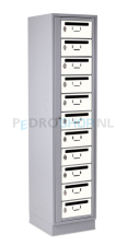 Deze postvakkenkast biedt ruimte voor het opbergen van poststukken en enkele eigendommen. De postvakkenkast kent 1 kolom, deze kolom is voorzien van 11 postvakken. Deze postvakkenkast kent voor de deuren de kleurcode: Wit Ral 9010 en voor de ombouw: Lichtgrijs Ral 7035.