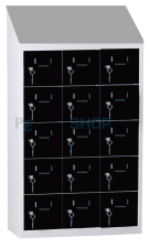 Met een afmeting van h109 x b62 x d30 cm biedt de kast voldoende ruimte voor 15 mini lockers, verdeeld over 3 kolommen met ieder 5 lockers. Elke locker heeft een afmeting van h16 x b15 x d27 cm.