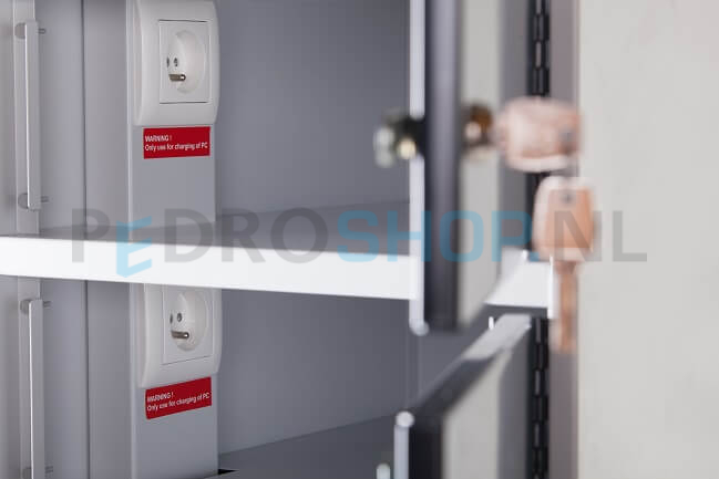De laptopkast beschikt over een slot voor elk vak. Elk vak beschikt standaard over een cilinderslot (met 2 sleutels per slot). Ook is er de mogelijkheid om de vakken te voorzien van valgrendelsloten. Op aanvraag kunnen er ook mechanische cijfersloten of elektronische pincode sloten gemonteerd worden op de vakken. Let wel op dat bepaalde sloten een levertijd kennen, dit kan op aanvraag besproken worden.