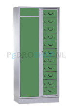 De SQ combinatie kledingdistributie- wasopvangkast met 11 deuren. Deze kast is een slimme combinatie van twee functies in één compacte behuizing. Links een apart vak voor het verzamelen van vuile was, rechts een kledinguitgiftesysteem met 11 individuele vakken. Praktisch, hygiënisch en ruimtebesparend.